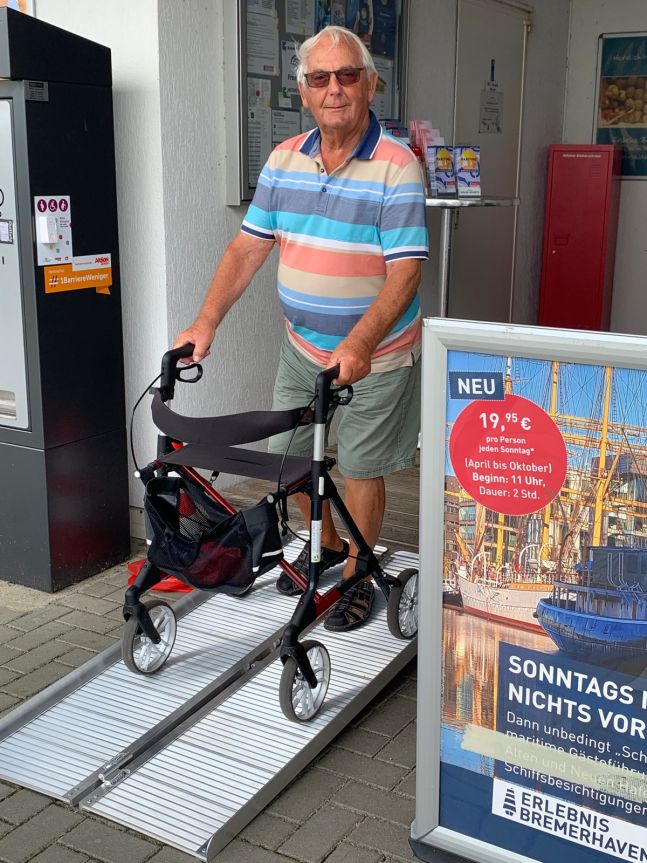 Die AG Barrieren war in Bremerhaven unterwegs und hat mobilen Rampen an die Einsatzorte gebracht. Unter anderem auf den Wohnmobilstellplatz an der Doppelschleuse. Der Wohnmobilist Herr Seele aus Minden hat sie gleich getestet und für gut befunden. :-) Die Aktion Mensch hat die mobilen Rampen im Rahmen unserer Serviceklingel-Kampagne finanziert. Danke!