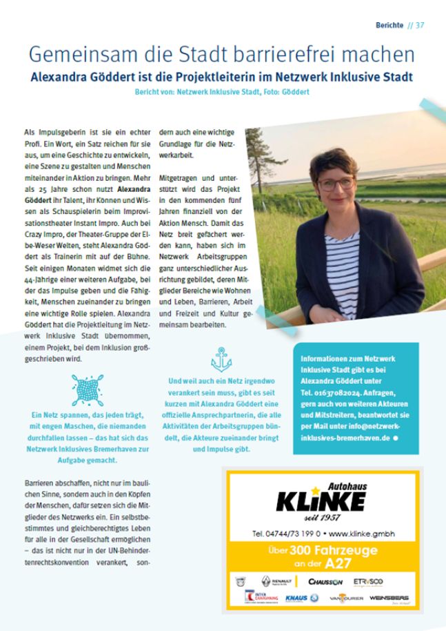 Als Impulsgeberin ist sie ein echter Profi. Ein Wort, ein Satz reichen für sie aus, um eine Geschichte zu entwickeln, eine Szene zu gestalten und Menschen miteinander in Aktion zu bringen. Mehr als 20 Jahre schon nutzt Alexandra Göddert ihr Talent, ihr Können und Wissen als Schauspielerin bei der Theatergruppe Instant Impro. Auch bei Crazy Impro, der Theater-Gruppe der Elbe-Weser Welten, steht Alexandra Göddert als Trainerin mit auf der Bühne. Seit einigen Monaten widmet sich die XXXjährige einer weiteren Aufgabe, bei der das Impulse geben und die Fähigkeit, Menschen zueinander zu bringen eine wichtige Rolle spielen. Alexandra Göddert hat die Projektleitung im Netzwerk Inklusive Stadt übernommen, einem Projekt, bei dem Inklusion großgeschrieben wird. Ein Netz spannen, das jeden trägt, mit engen Maschen, die niemanden durchfallen lassen – das hat sich das Netzwerk Inklusives Bremerhaven zur Aufgabe gemacht. Barrieren abschaffen, nicht nur im baulichen Sinne, sondern auch in den Köpfen der Menschen, dafür setzen sich die Mitglieder des Netzwerks ein. Ein selbstbestimmtes und gleichberechtigtes Leben für alle in der Gesellschaft ermöglichen – das ist nicht nur in der UN-Behindertenrechtskonvention verankert, sondern auch eine wichtige Grundlage für die Netzwerkarbeit. Mitgetragen und unterstützt wird das Projekt in den kommenden fünf Jahren finanziell von der Aktion Mensch. Damit das Netz breit gefächert werden kann, haben sich im Netzwerk Arbeitsgruppen ganz unterschiedlicher Ausrichtung gebildet, deren Mitglieder Bereiche wie Wohnen und Leben, Barrieren, Arbeit und Freizeit und Kultur gemeinsam bearbeiten. Und weil auch ein Netz irgendwo verankert sein muss, gibt es seit kurzen mit Alexandra Göddert eine offizielle Ansprechpartnerin, die alle Aktivitäten der Arbeitsgruppen bündelt, die Akteure zueinander bringt und Impulse gibt.
