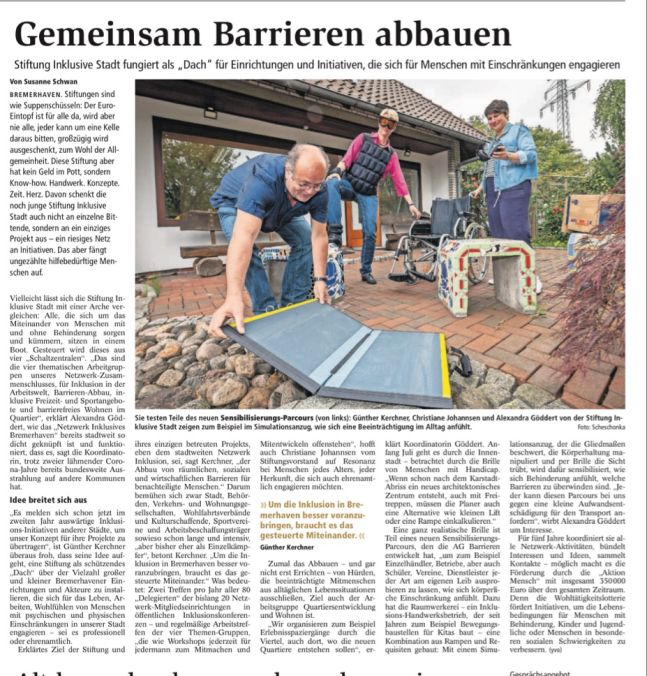 Wir freuen uns, dass die Nordsee Zeitung über uns und unseren Projektträger, die Stiftung Inklusive Stadt berichtet. Der Artikel ist im Bremerhaven-Teil der Ausgabe vom 10.06.2022 zu finden.