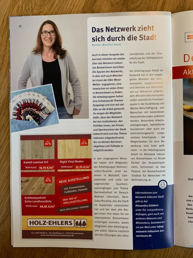 Auch in der druckfrischen aktuellen Ausgabe des EWW Journal wird wieder über unser Netzwerk berichtet. Martina Löwner, unsere Fachfrau für Öffentlichkeitsarbeit, hat einen Artikel mit dem Titel "Das Netzwerk zieht sich durch die Stadt" geschrieben. Die Elbe Weser Welten sind Kooperationspartner des Netzwerk Inklusives Bremerhaven und stellen uns in jeder Ausgabe ihres Journals eine Seite zur Berichterstattung über unsere Arbeit und Aktivitäten zur Verfügung. Danke dafür!