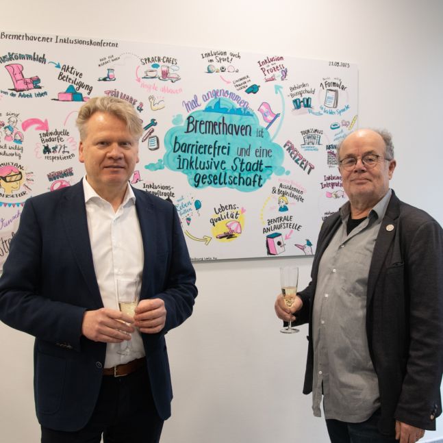 Wir freuen uns riesig, denn das Graphic Recording Kunstwerk, das bei der letzten Inklusionskonferenz entstanden ist, hat eine tolle Ausstellungsfläche gefunden. Die Stäwog präsentiert es nun in Bremerhaven in der Barkhausenstraße 22 in der Eingangshalle. Rund 150 Menschen haben bei der Konferenz an einer Zukunftsvision von einem barrierefreien und inklusiven Bremerhaven gearbeitet.