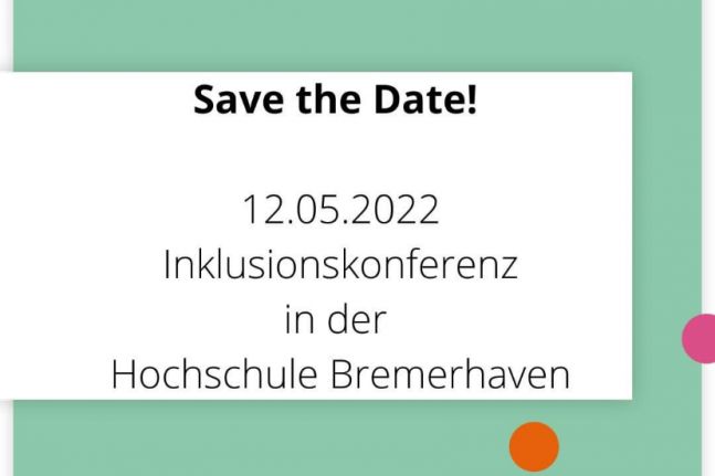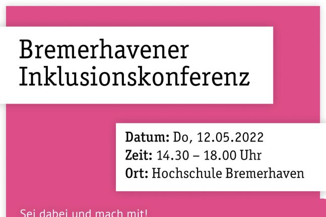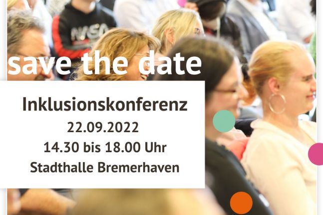 Nach der ergebnisreichen, bunten und ausgebuchten Inklusionskonferenz im Mai,freuen wir uns, Sie auf die nächste Inklusionskonferenz aufmerksam machen zu dürfen: am Donnerstag, 22.09.2022, von 14.30 bis 18.00 Uhr, in der Stadthalle Bremerhaven. ...