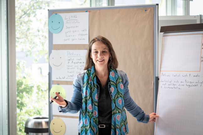 Vier wunderbare Steckbriefe und Lebenswege der Zukunft hat die Moderatorin Sophie Schad an ihrer Arbeitsstation mit den Teilnehmer:innen gestaltet. An dieser Arbeitsstation ging es um das Thema „Politische Beteiligung in der Zukunft“. Mit den vier erdachten Menschen aus der Zukunft, Shiva, Lukas, Ute und Petrus, haben die Teilnehmer:innen vier ganz unterschiedliche Leben kreiert und gezeigt, wie politische Beteiligung und bürgerschaftliches Engagement in der Zukunft aussehen können, so dass alle die Chance haben, Politik mitzugestalten.